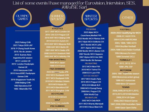 I manage global projects for prestigious competitions, including the Olympic Games, Paralympic Games, Youth Olympics, the four Grand Slam tennis tournaments, World Championships in athletics, swimming, basketball, volleyball, handball, gymnastics, skiing, biathlon, ice hockey, figure skating, curling, canoeing, equestrian events, cycling (Tour de France, Vuelta a España, Giro d'Italia), Formula 1, and other motorsports (MotoGP, Superbikes, Dakar Rally).
